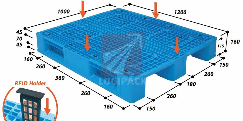 Quy cách Kích thước: 1200 x 1000 x 160 mm Chất liệu: PPC/ HDPE Loại : 1 Mặt.  Bề mặt lưới tản nhiệt. Màu chuẩn: Xanh Tải trọng tĩnh: 4000 kgs Tải trọng động: 1000 kgs Tải trọng trên kệ: 1000 kgs Thiết bị: Xe nâng Forlkit: 4 đường nâng Xe nâng tay: 2 đường nâng Stacker: 2 đường nâng Ứng dụng: Chuyên dùng chứa hàng trong kho Phù hợp cho các mặt hàng: điện tử, thực phẩm nông sản, bao bì, …..